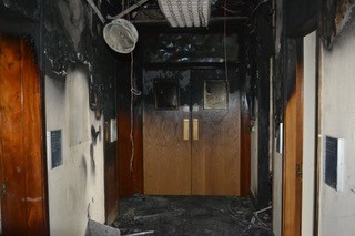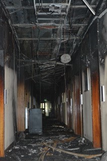 This photo clearly shows a smoke blackened area in the main office and, beyond the fire doors, clean undamaged walls. This clearly shows the effectiveness of a properly fitted door.